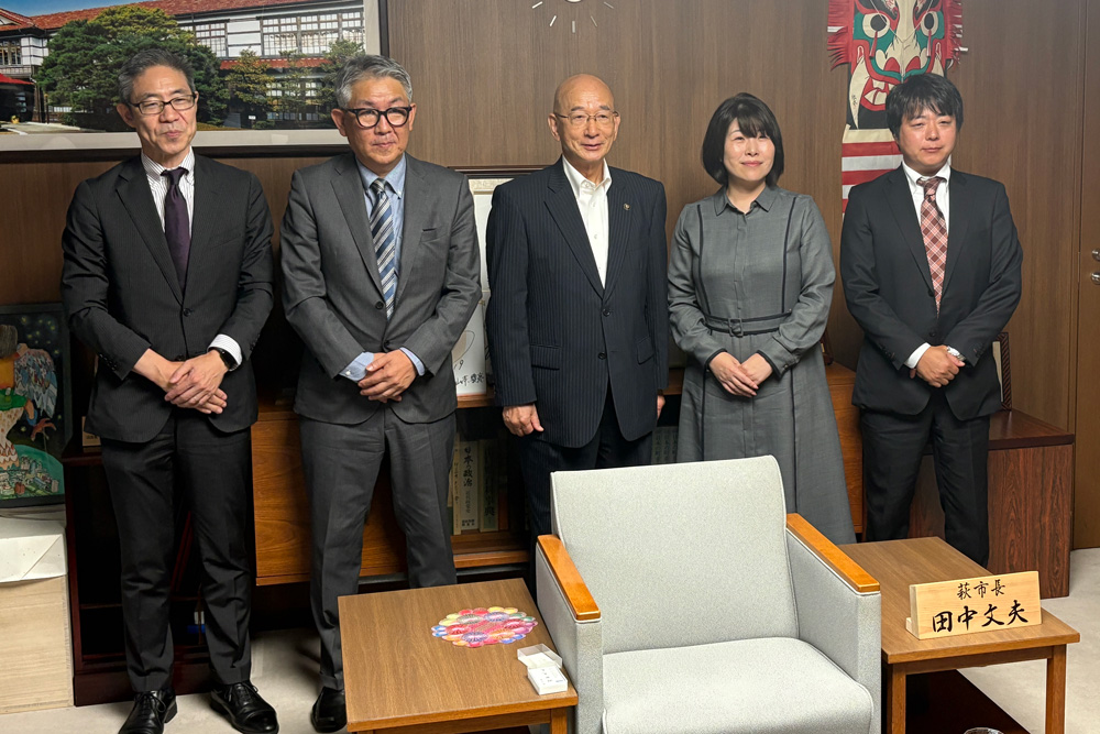 設置後、遅ればせながら、萩市長である 田中文夫 市長を表敬訪問し、設置の経緯や今後の普及・地域への貢献についてご報告をさせていただきました。