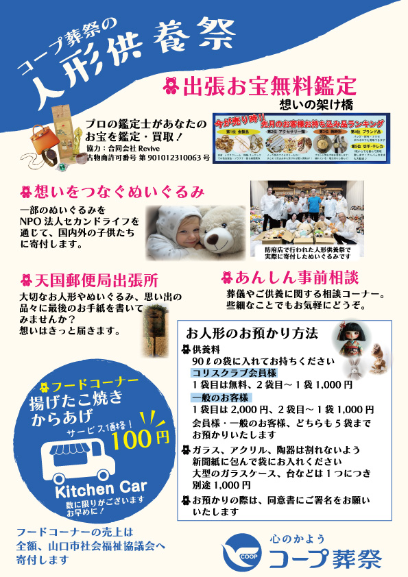 山口市にございます「コープ葬祭 つばきおごおり」にて「人形供養祭」を開催いたします。