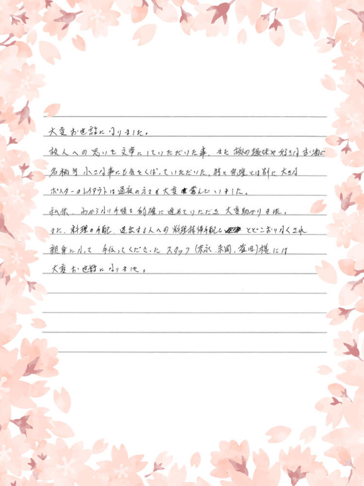 故人への思いを文章にしていただいた事、また、故人の趣味や好きなお酒の銘柄等小さな事にも気を配っていただいた。特に祭壇と別に大きなポスターのレイアウトは通夜の方々も大変喜んでいました。