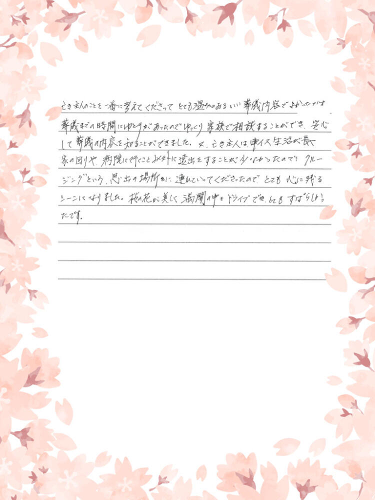 葬儀までの時間にゆとりがあったので、ゆっくり家族で相談することができ、安心して葬儀の内容を知ることができました。又、亡き主人は車イス生活が長く、家の周りや病院に行くこと以外に遠出をすることが少なかったので、クルージングという思い出の場所に連れていってくださったので、とても心に残るシーンになりました。桜の花が美しく満開の中をドライブでき、とてもすばらしかったです。