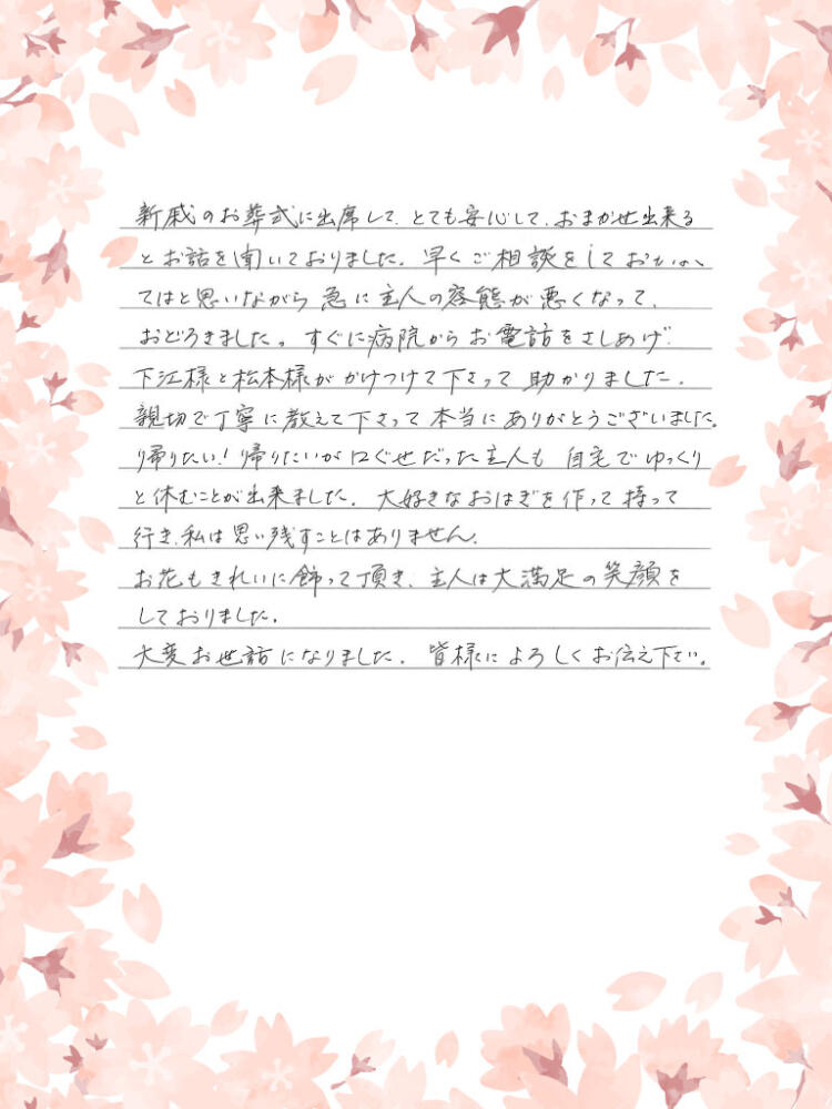 親戚のお葬式に出席して、とても安心しておまかせ出来るとお話を聞いておりました。早くご相談をしておかなくてはと思いながら、急に主人の容態が悪くなっておどろきました。すぐに病院からお電話をさしあげ、下江様と松本様がかけつけて下さって助かりました。