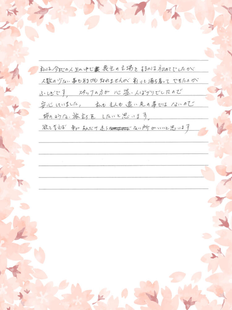 スタッフの方が心温かい人ばかりでしたので安心していました。私も主人も遠い先の事ではないので姉のような旅立ちをしたいと思います。