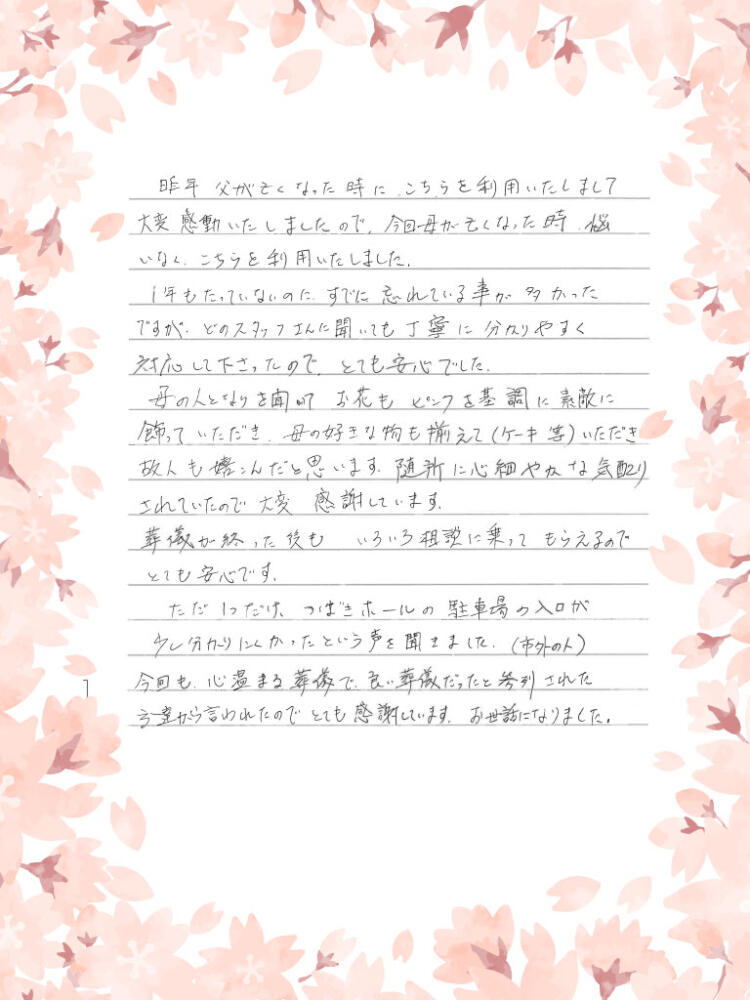 母の人となりを聞いて、お花もピンクを基調に素敵に飾っていただき、母の好きな物も揃えて(ケーキ等)いただき、故人も嬉こんだと思います。随所に心細やかな気配りされていたので大変感謝しています。