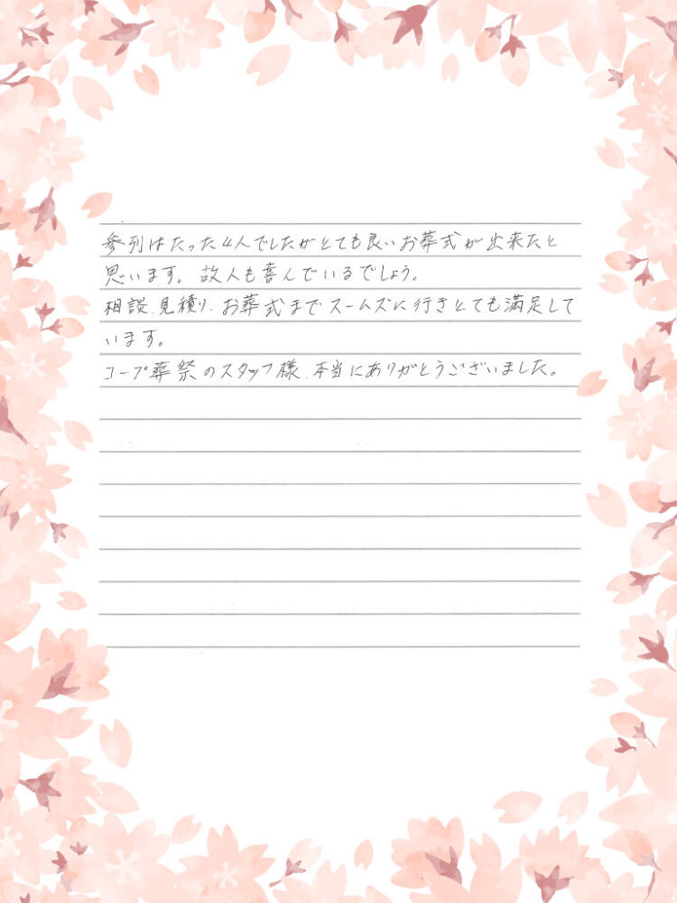 参列はたった4人でしたがとても良いお葬式が出来たと思います。故人も喜んでいるでしょう。