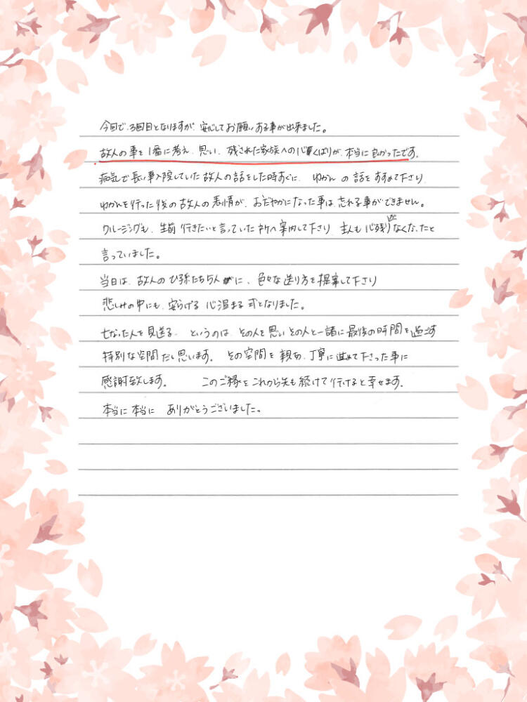 亡くなった人を見送るというのは、その人を思い、その人と一緒に最後の時間を過ごす特別な空間だと思います。その空間を親切、丁寧に進めて下さった事に感謝いたします。