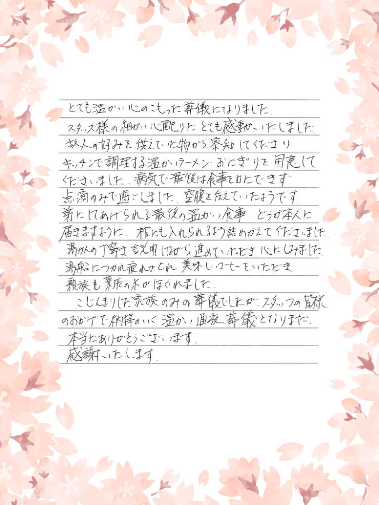 故人の好みを供えていた物から察知してくださり、キッチンで調理する温かいラーメン、おにぎりを用意してくださいました。病気で最後の食事、どう本人に届きますように、棺にも入れられるよう詰めかえてくださいました。湯かんの丁寧さ、説明しながら進めていただき心にしみました。