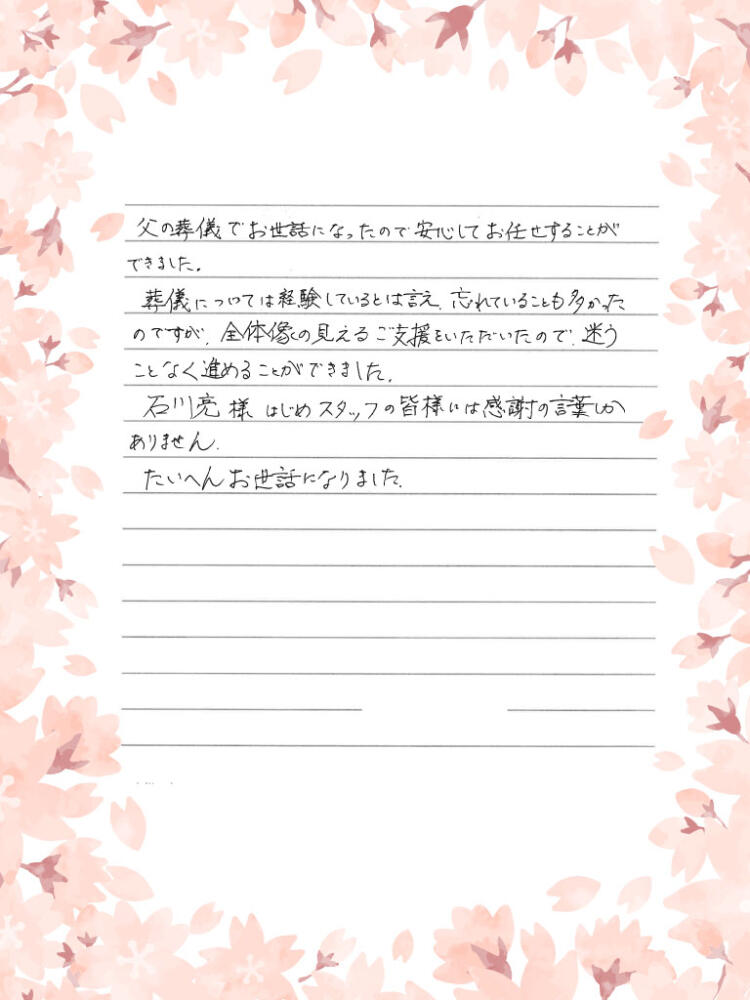 父の葬儀でお世話になったので安心してお任せすることができました。