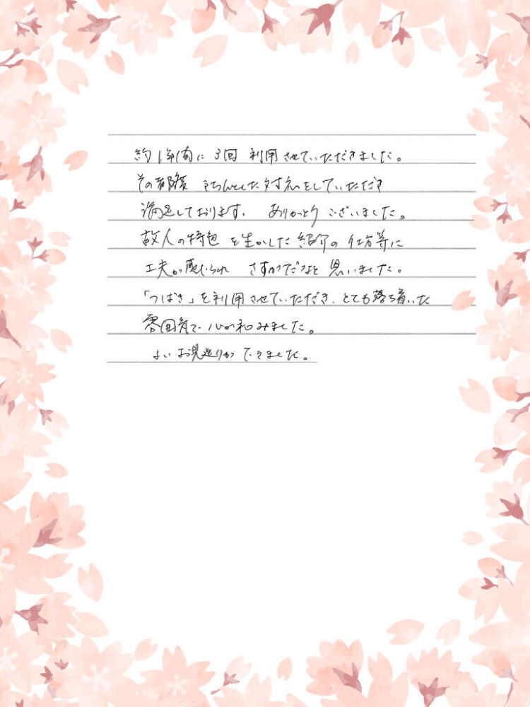 「つばき」を利用させていただき、とても落ち着いた雰囲気で心が和みました。