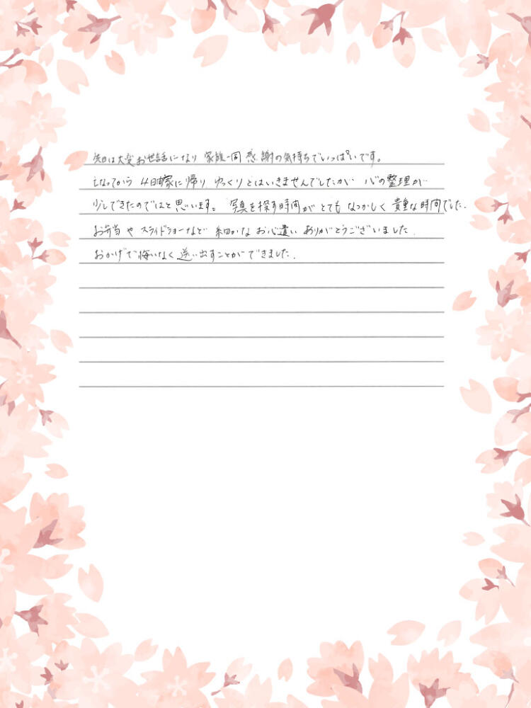 先日は大変お世話になり、家族一同感謝の気持ちでいっぱいです。