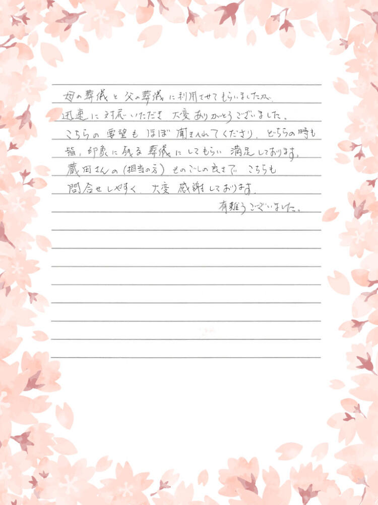 母の葬儀と父の葬儀に利用させてもらいましたが、迅速に対応いただき大変ありがとうございました。こちらの要望もほぼ聞き入れてくださり、どちらの時も皆、印象に残る葬儀にしてもらい満足しております。