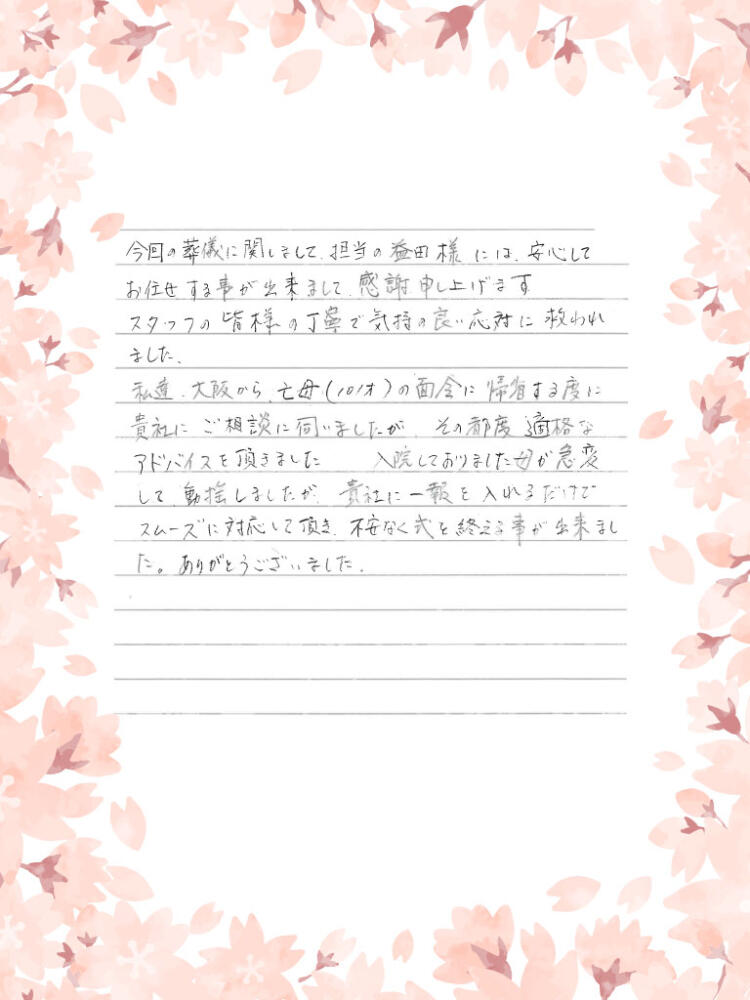 私達、大阪から亡き母の面会に帰省するたびに貴社のご相談に伺いましたが、その都度、適切なアドバイスを頂きました。入院しておりました母が急変して動揺しましたが、貴社に一報を入れるだけでスムーズに対応して頂き、不安なく式を終える事が出来ました。ありがとうございました。