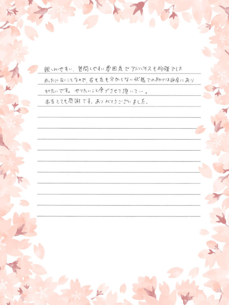 めったにないことなので右も左も分からない状態での助けは非常にありがたかったです。やりたいこと全てさせていただいて。