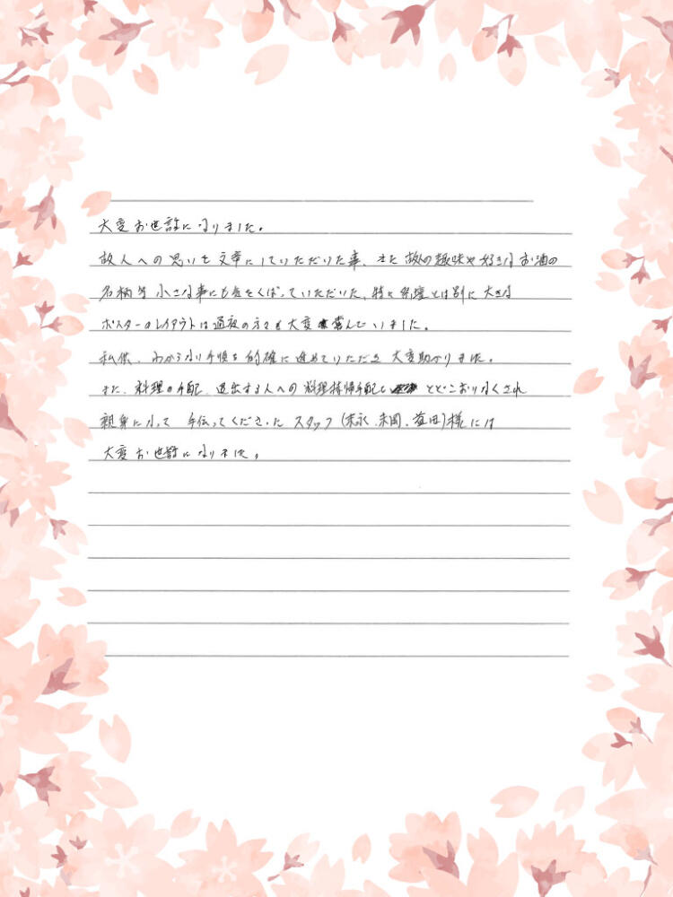 故人への思いを文章にしていただいた事、また故人の趣味や好きなお酒の銘柄など小さな事にも気を配っていただいた。特に祭壇と別に大きなポスターのレイアウトは通夜の方々も大変喜んでいました。