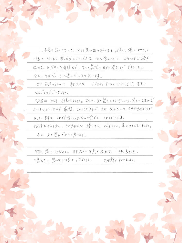 家族の悲しい思いや、父との思い出を振り返る私達に、優しくよりそって一緒に泣いたり笑ったりしてくださって、とても悲しいのに、あたたかな空気が流れておだやかな気持ちで、父との最後の日々を送ることができました。