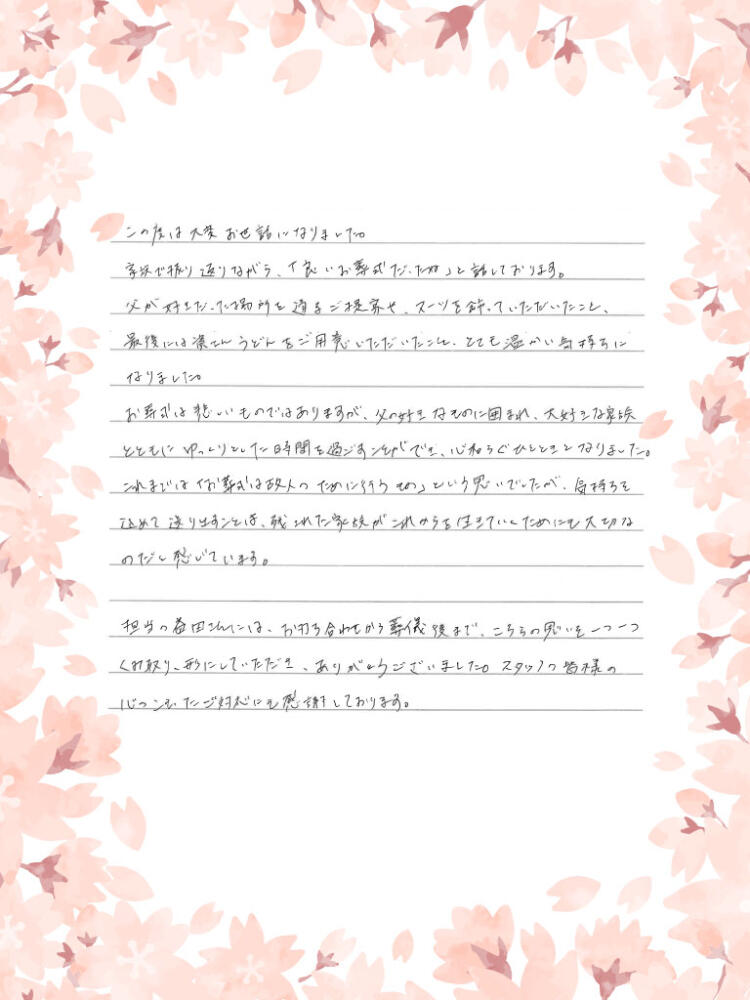スタッフの皆様の心のこもったご対応にも感謝しています。