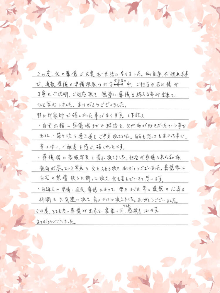 とても良い葬儀が出来て家族一同とても感謝しています。